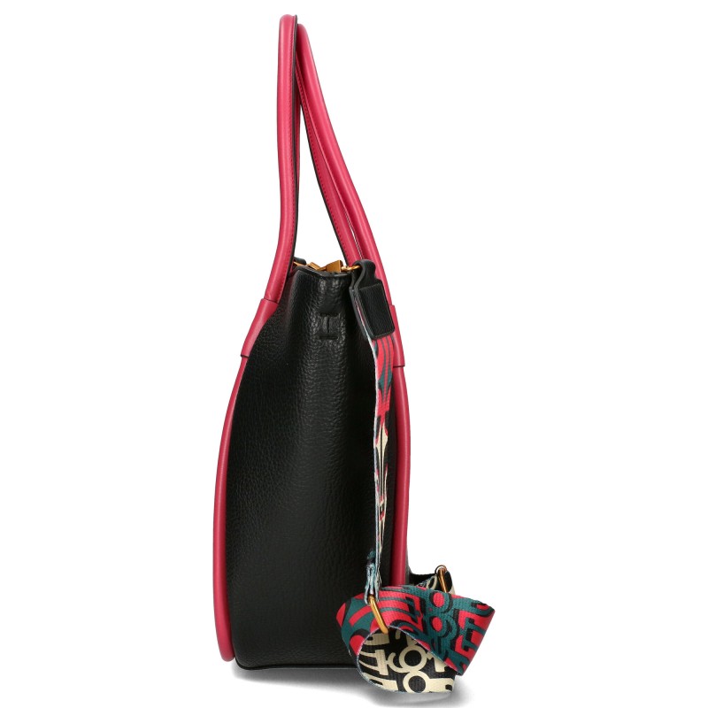 A táska magas, kényelmes fogantyúkon lóg, a széles, színes, logóval ellátott pánt pedig dizájner jelleget kölcsönöz neki. Az elején egy gyönyörű rovarlogó található, a kollekció szimbóluma. A belső rész aprólékosan kidolgozott, funkcionalitását pedig az alján található védőlábak fokozzák, amelyek védenek a karcolásoktól.