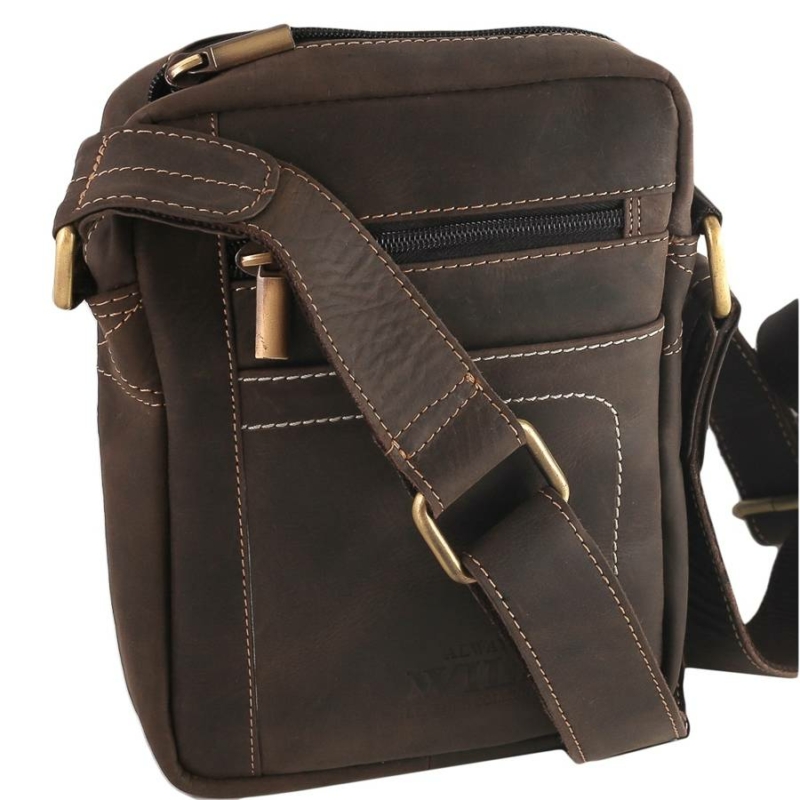 Férfi bőrtáska hosszú, állítható övvel. Egyrekeszes, bélelt. Két belső zsebbel és három külső zsebbel van ellátva, melyek közül kettő cipzáros.