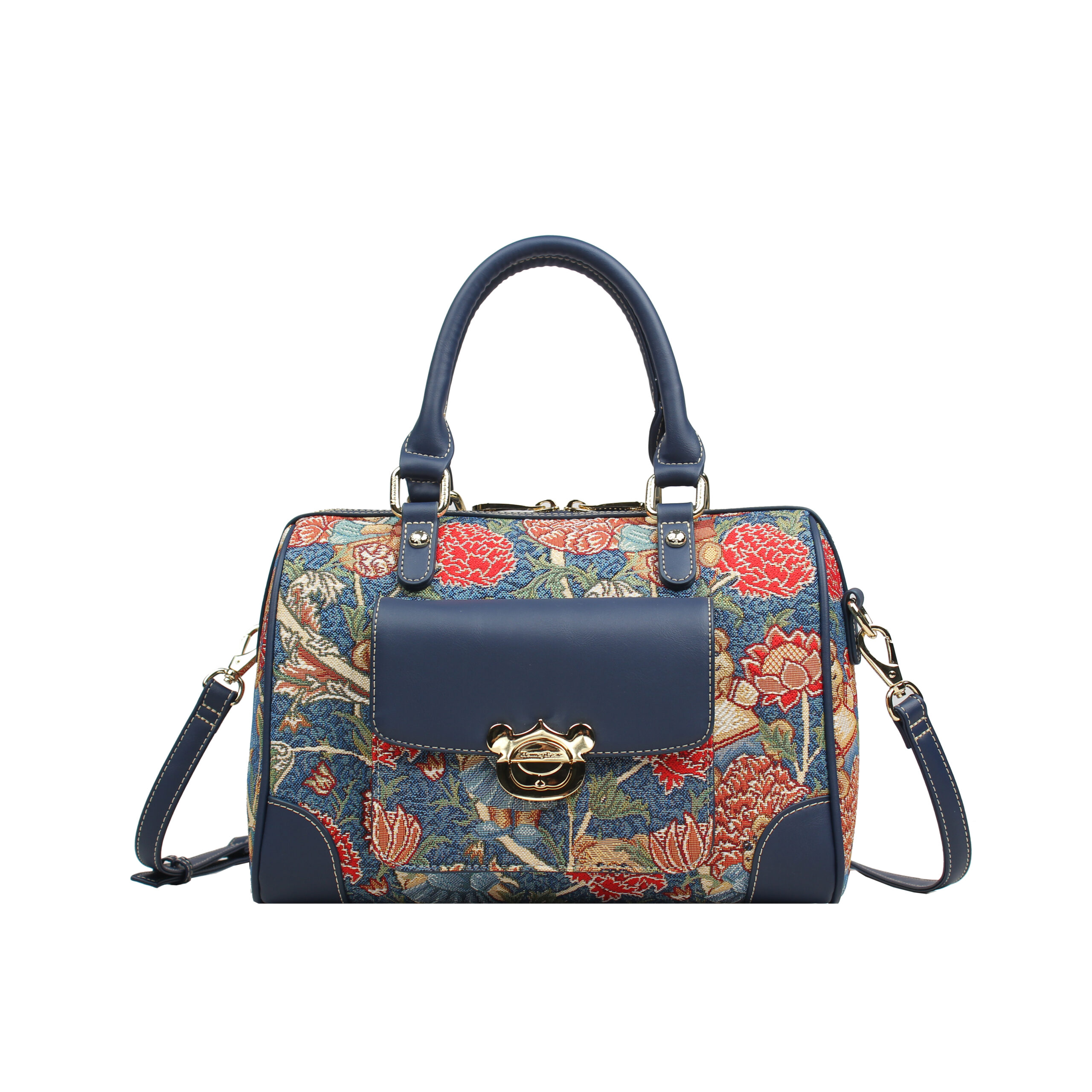 A prémium minőségű műbőr részletek és a letisztult formavilág finoman ellensúlyozzák a minta könnyedségét, míg az aranyszínű fém kiegészítők exkluzív megjelenést adnak. A kézi fogantyúk és a lecsatolható, állítható vállpánt rugalmas viselési lehetőséget kínálnak.
