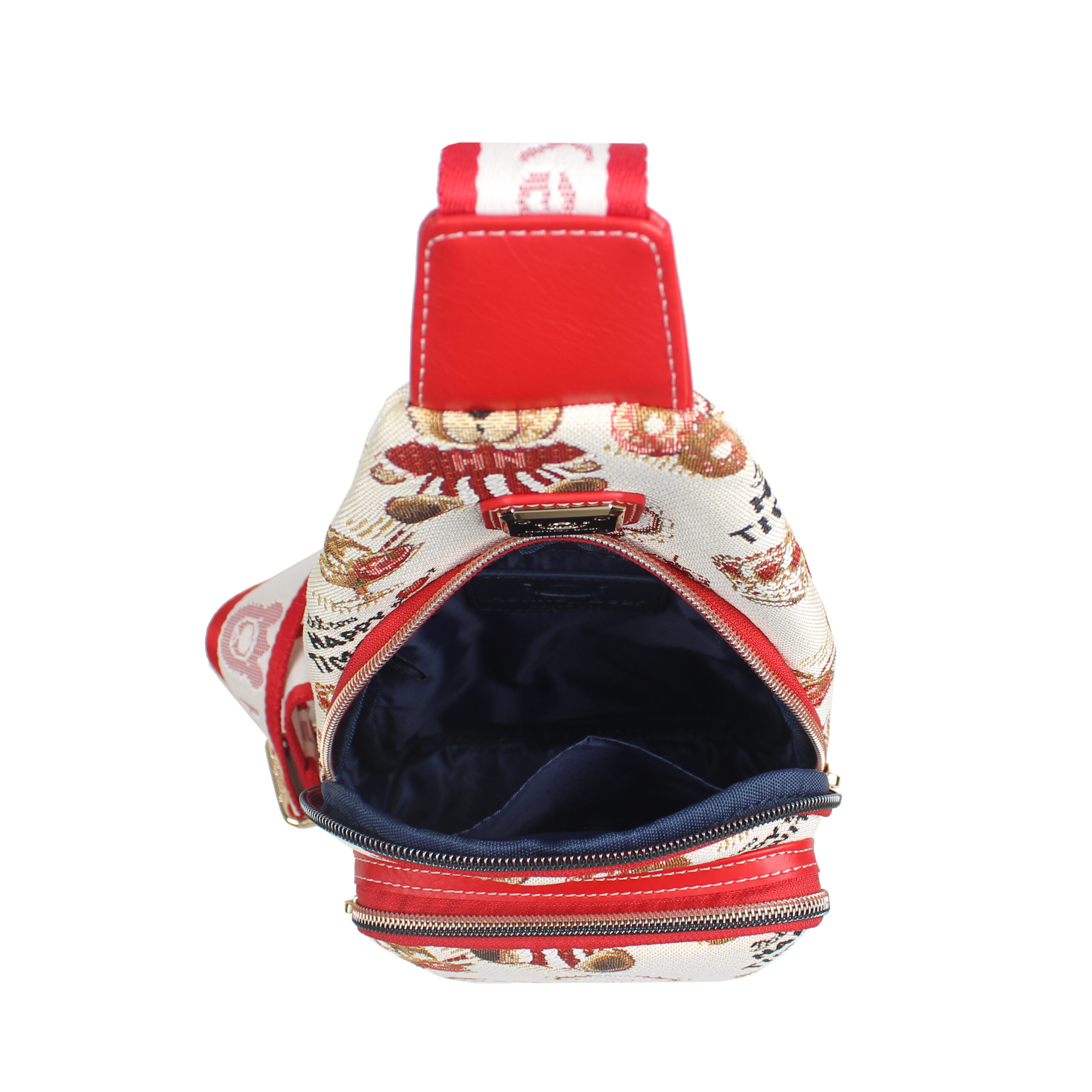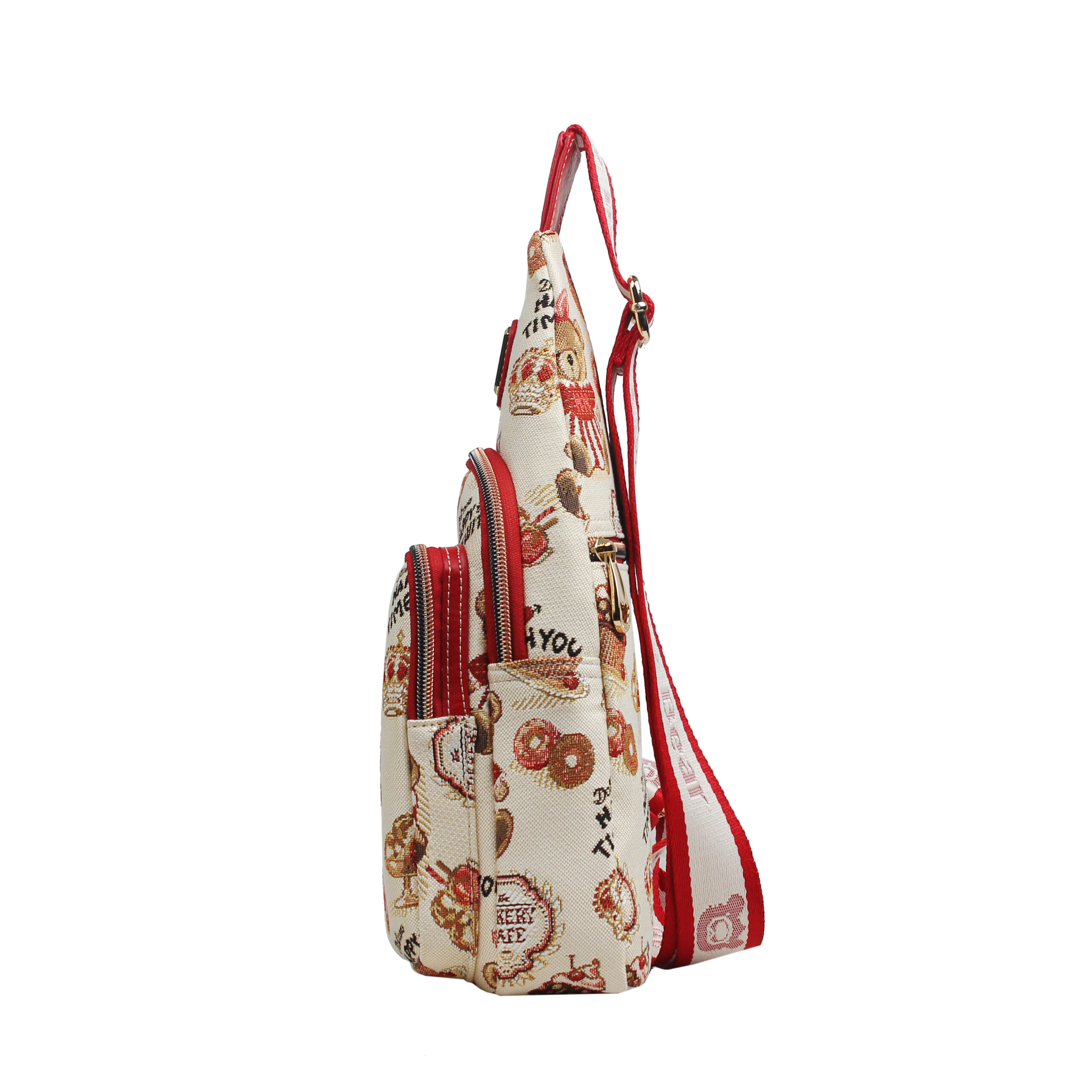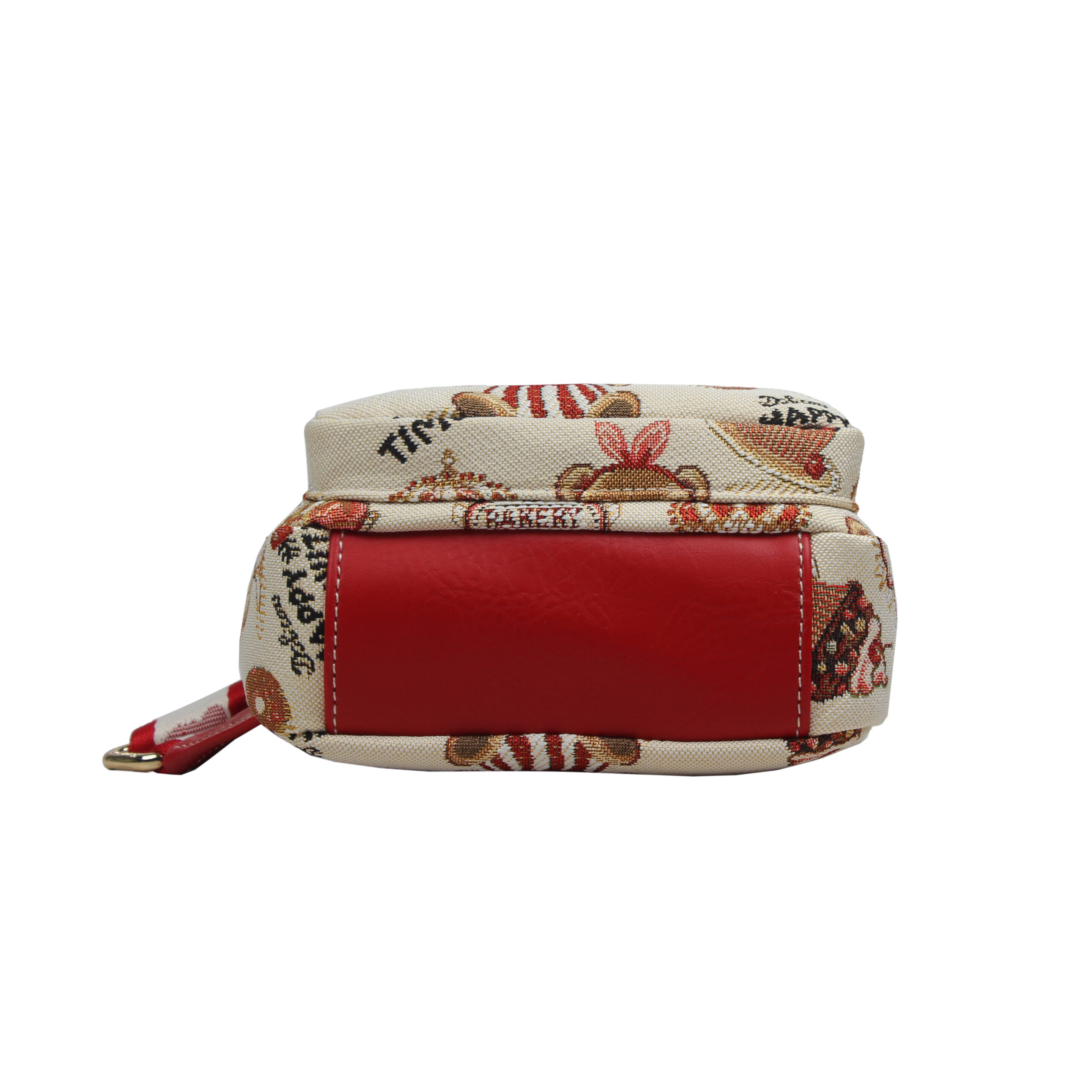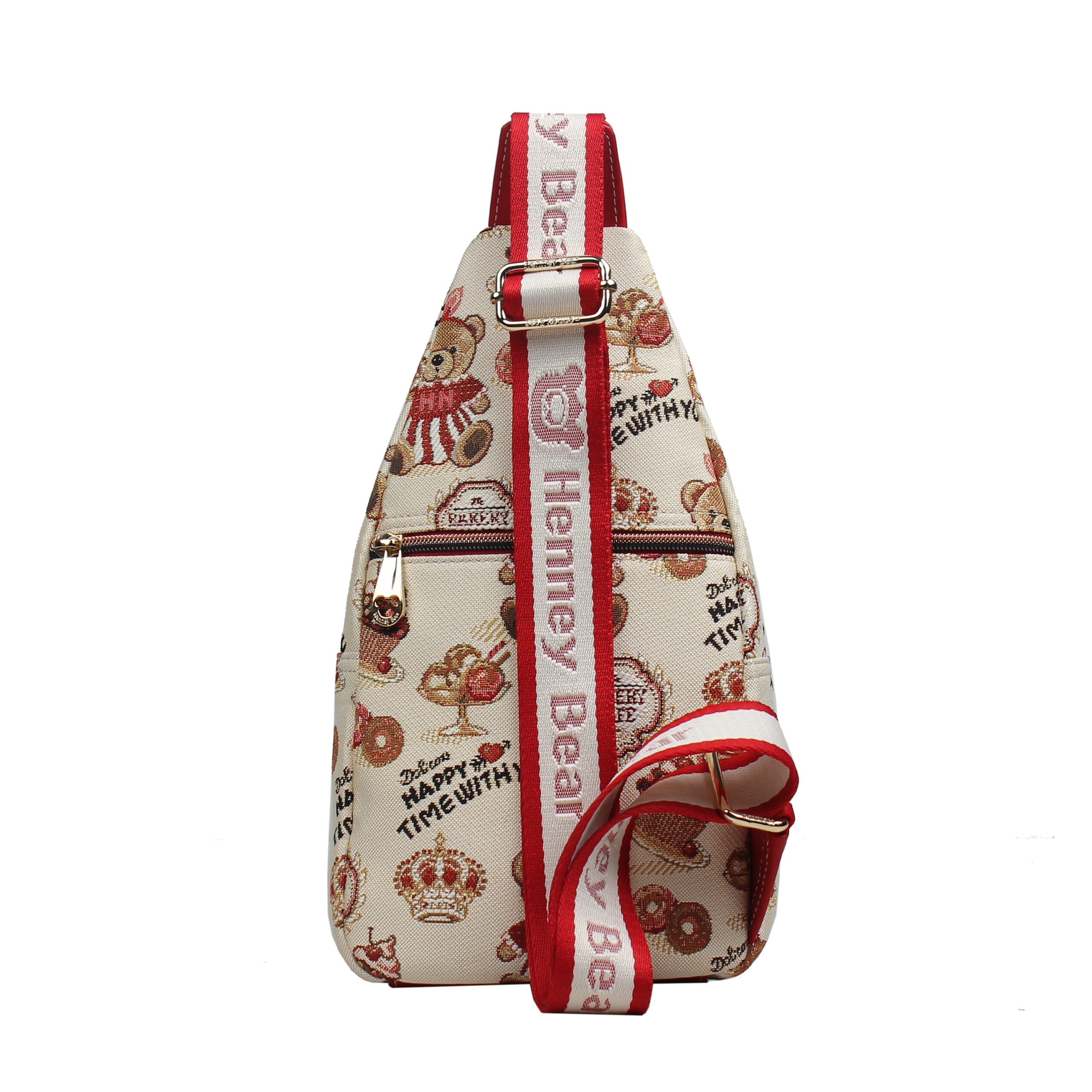 A Henney Bear CAKE BEAR női oldaltáska játékos és vidám hangulatot sugároz, amelyet a sütemények és aranyos macifigurák gobelin stílusú mintája tesz igazán különlegessé. A piros műbőr részletek és az aranyszínű fém kiegészítők elegánsan egészítik ki a táska praktikus, modern kialakítását.