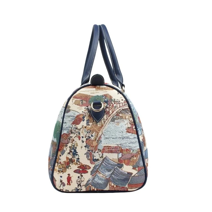 A Henney Bear RIVER SIGHT utazó táska különleges, festményszerű mintájával és elegáns kivitelezésével a stílusos utazók kedvenc kiegészítője. A részletgazdag gobelin szövet és a sötétkék műbőr elemek klasszikus, mégis modern megjelenést biztosítanak.