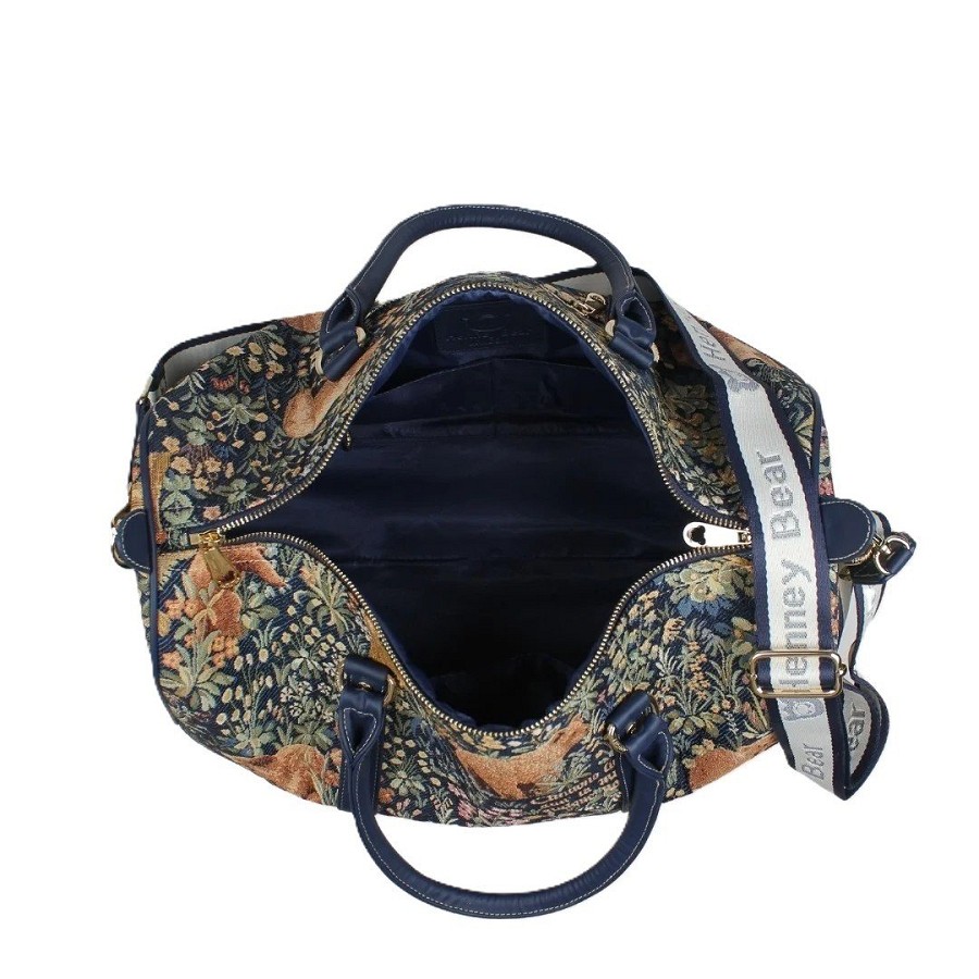 A Henney Bear WALKING THE FOREST utazó táska a természet és a klasszikus elegancia harmóniáját testesíti meg. A gobelin szöveten megjelenő medvék és erdei növények részletgazdag, festményszerű kompozíciója különleges, időtlen hangulatot teremt. A mélyzöld, kék és barna árnyalatok nyugalmat és természetközeliséget sugároznak, miközben a táska egyedi mintázata valódi karaktert ad minden utazónak.