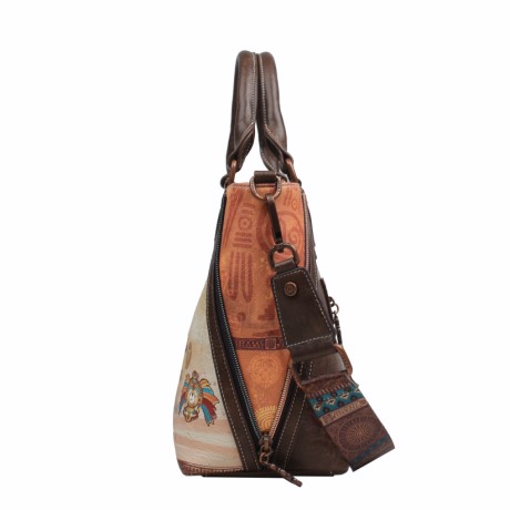 A Janet Maya Journey kézitáska, válltáska különleges, maja kultúrát idéző grafikájával és meleg földszíneivel karakteres, művészi megjelenést kínál.