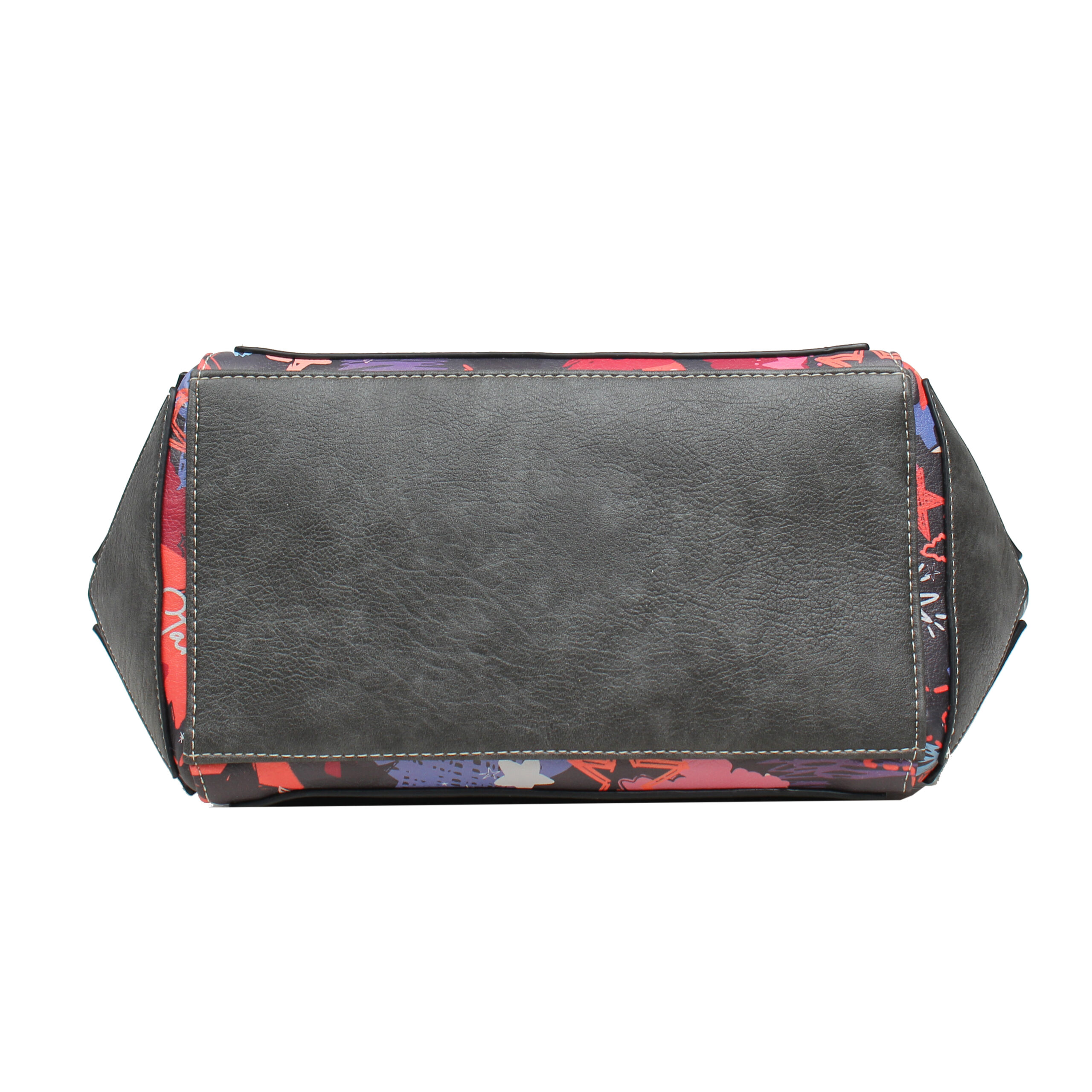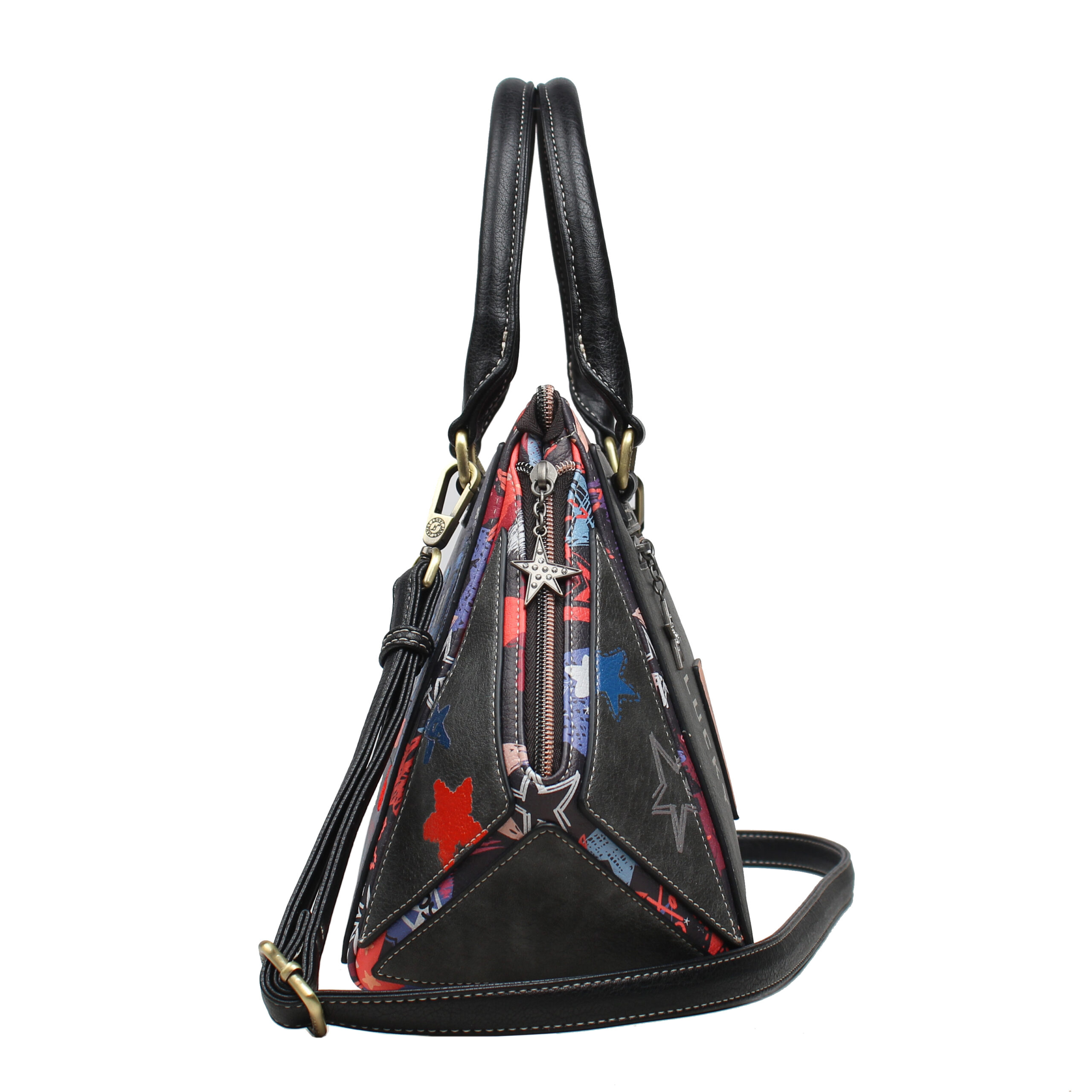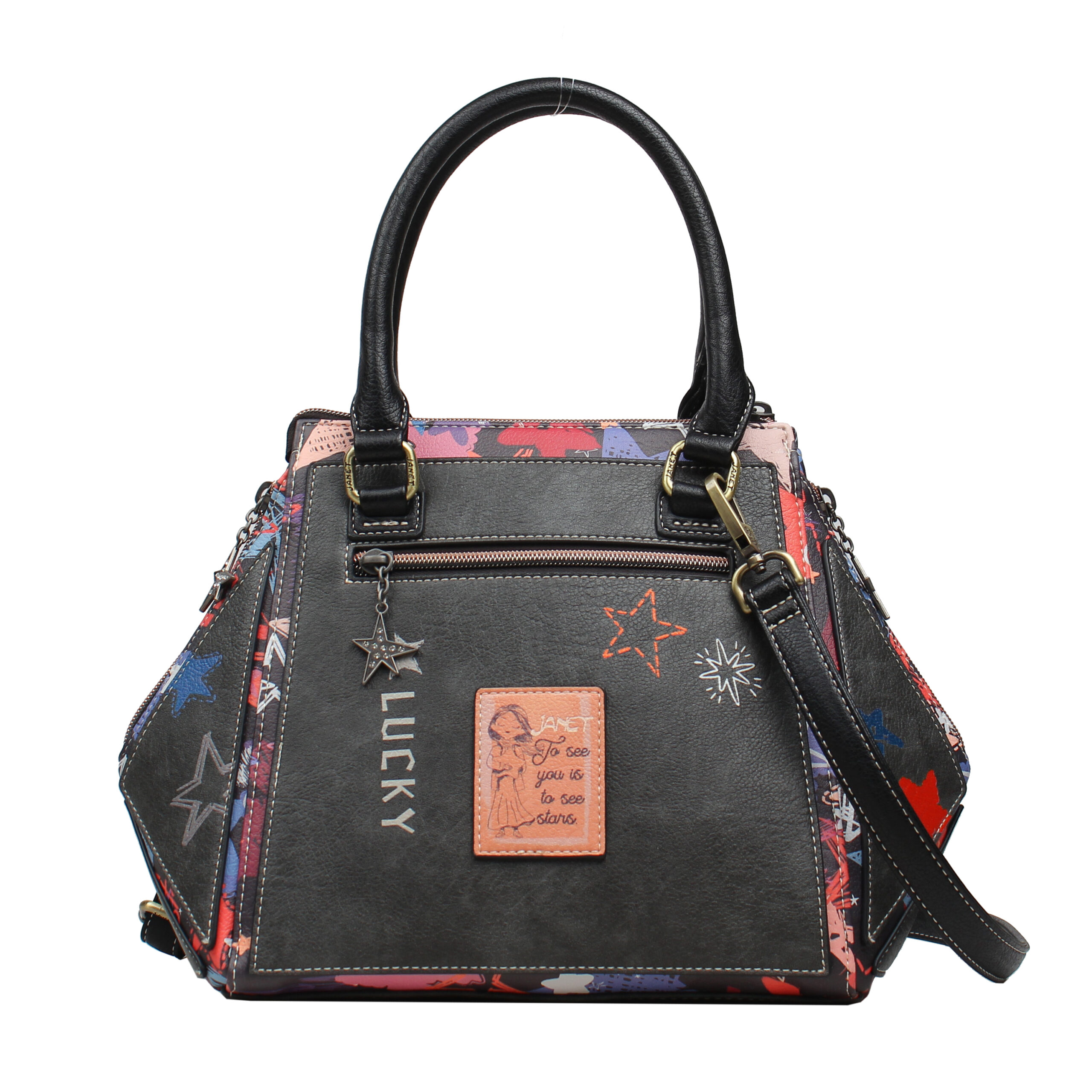 Az oldalpanelek élénk csillagmintás grafikát kaptak, amelyek energikus, fiatalos karaktert adnak a táskának. A fekete kézi fogantyúk és pántok elegáns kontrasztot alkotnak a színes mintákkal.