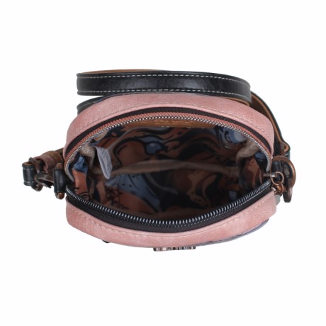 A táska elején pasztell rózsaszín, bézs, sárgás és púderes árnyalatok olvadnak egymásba, ecsetvonásszerű díszítésekkel és apró, csillogó elemekkel kiegészítve. A minta könnyed, nőies és derűs megjelenést teremt, miközben a fekete és barna részletek elegánsan keretezik a design egészét.