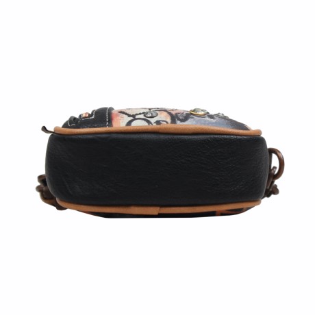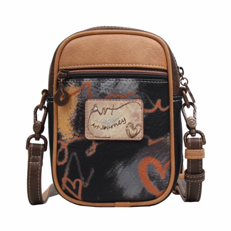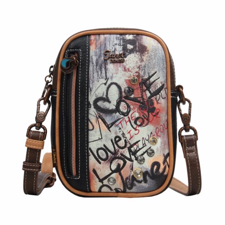 A táska elején modern, festékszerű hátterű, graffitis betűk és szív motívumok jelennek meg fekete, piros és narancs árnyalatok játékával. A design fiatalos, lendületes és igazi művészi karaktert sugall. A barna és bézs részletek finoman ellensúlyozzák az élénk grafikát, így harmonikus, mégis feltűnő összkép születik.