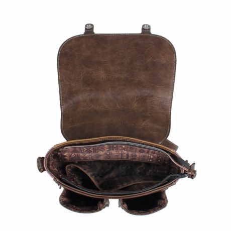 A táska előlapján gazdagon díszített, terrakotta és barna árnyalatokban megjelenő maja grafika látható, amelyhez tökéletesen illeszkednek a sötétbarna, antik hatású elemek. A dupla csatos díszítés klasszikus, vintage hangulatot ad, miközben a modern formavilág praktikus használhatóságot biztosít.
