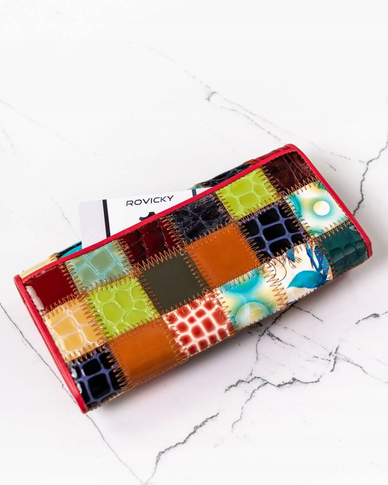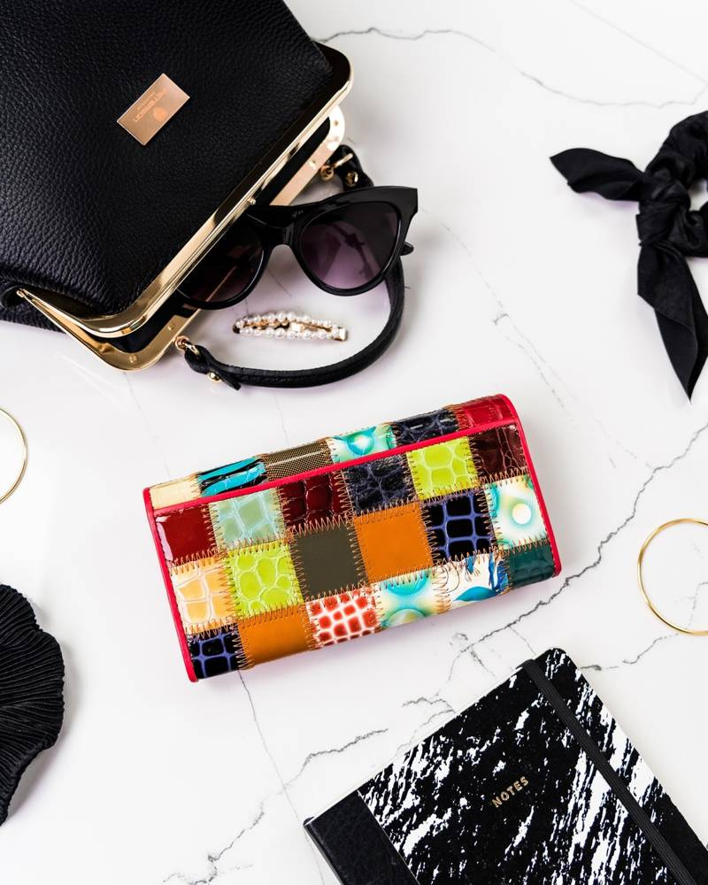 Patchwork minta | A pénztárca felületét patchwork minta díszíti. Ez egy varrási módszer, amelyben különböző textúrájú és mintájú szövetdarabokat varrnak össze; ( Minden modell eltérő mintázatú )