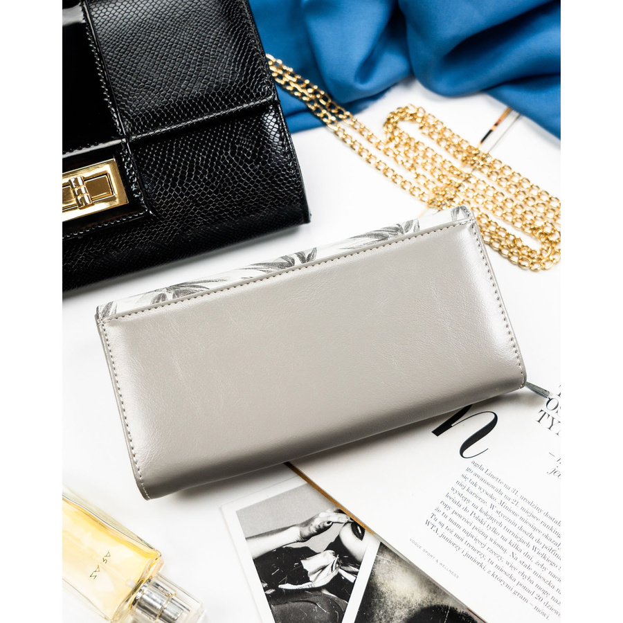 • Egyedi kialakítás – a pénztárca elejét mintás ökológiai bőr borítja, ami eredeti és nőies karaktert kölcsönöz az egésznek.
