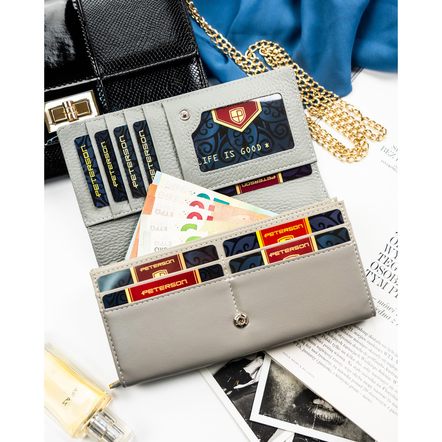 Nagyméretű női pénztárca sokszínű természetes és ökológiai bőrből varrva, pattintással lezárva – Peterson