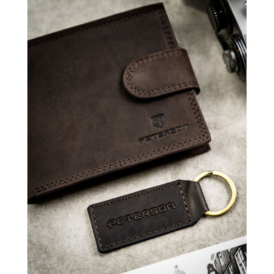 Ajándék szett: Kulcstartó és barna férfi bőr pénztárca patenttal – Peterson