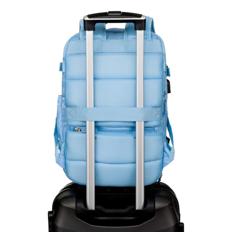 A hátizsák hátsó falán van egy fogantyú, amelyet a bőröndhöz rögzíthetsz.