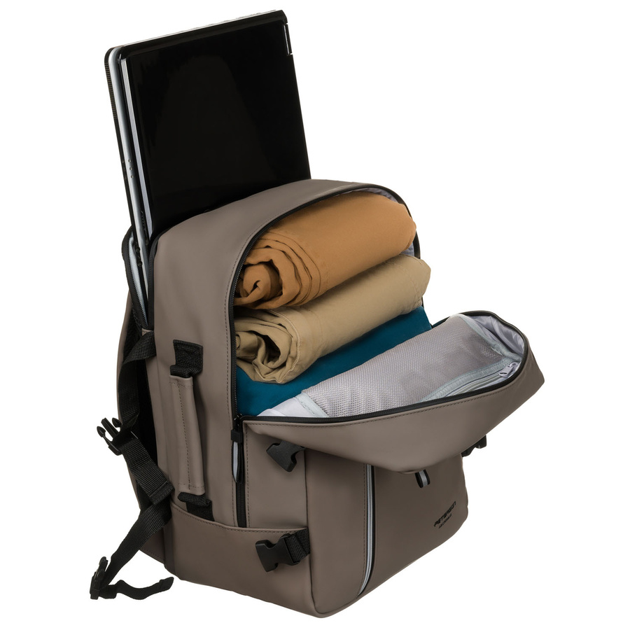 A hátizsák hátoldalán egy speciális hevederrel van felszerelve, amely lehetővé teszi, hogy biztonságosan rögzítse az utazóbőrönd fogantyújához. Ez lehetővé teszi, hogy kényelmesen hordozza a poggyászán, felesleges hordozás nélkül. Ez a megoldás tökéletes repülőtéri transzferekhez, üzleti utakhoz vagy hosszú vasútállomási utazásokhoz.