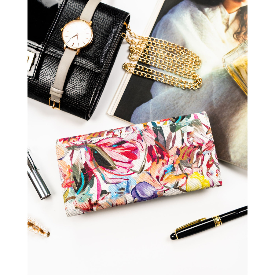 A pénztárca kiváló minőségű természetes bőrből készült, finom, tapinható szerkezettel. A modell nem lakkozott – matt felületű, lenyűgöző, színes virágmintával. Az egészet szilárd, aranyszínű fém szerelvények egészítik ki.