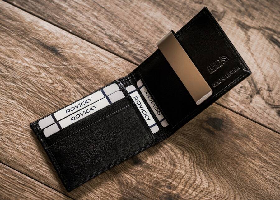Természetes bőrből készült kis férfi bankjegy – Rovicky A legmagasabb minőségi kidolgozás – a pénztárca kiváló minőségű természetes bőrből készült, kívülről szénszálas réteggel bevonva;