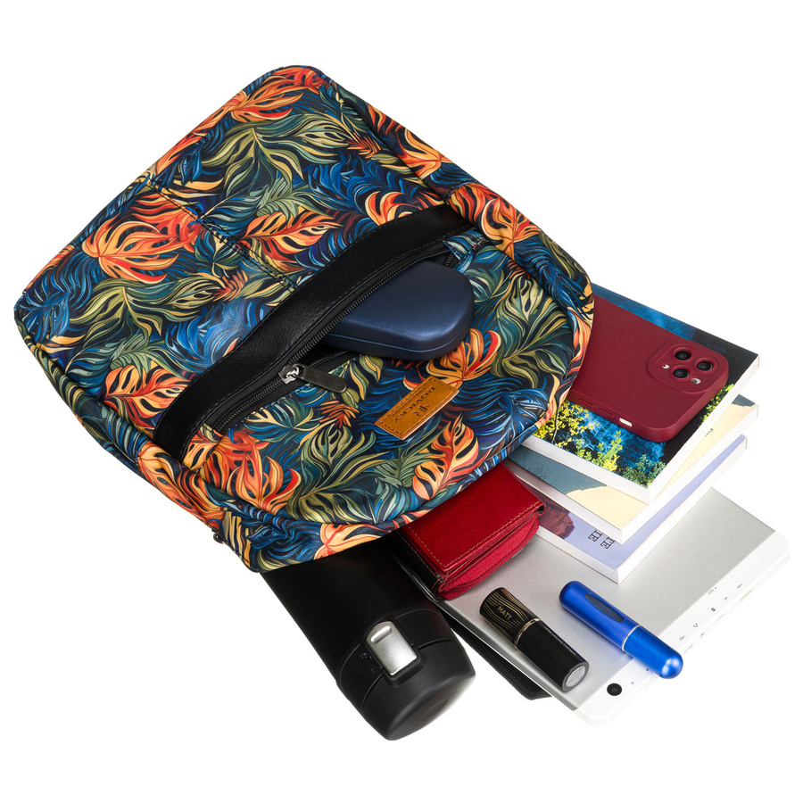 • Növények, színes mintázat | A hátizsák aranyos, színes mintával díszített;