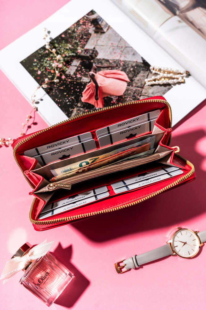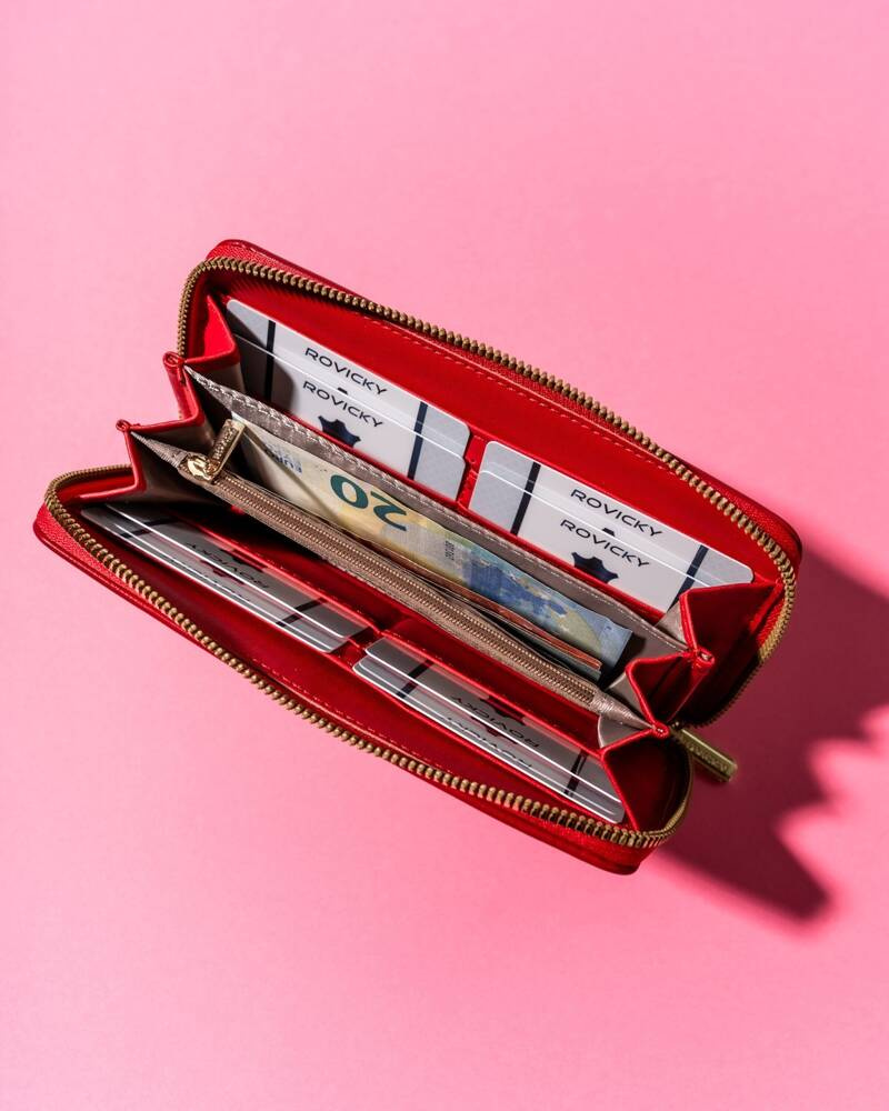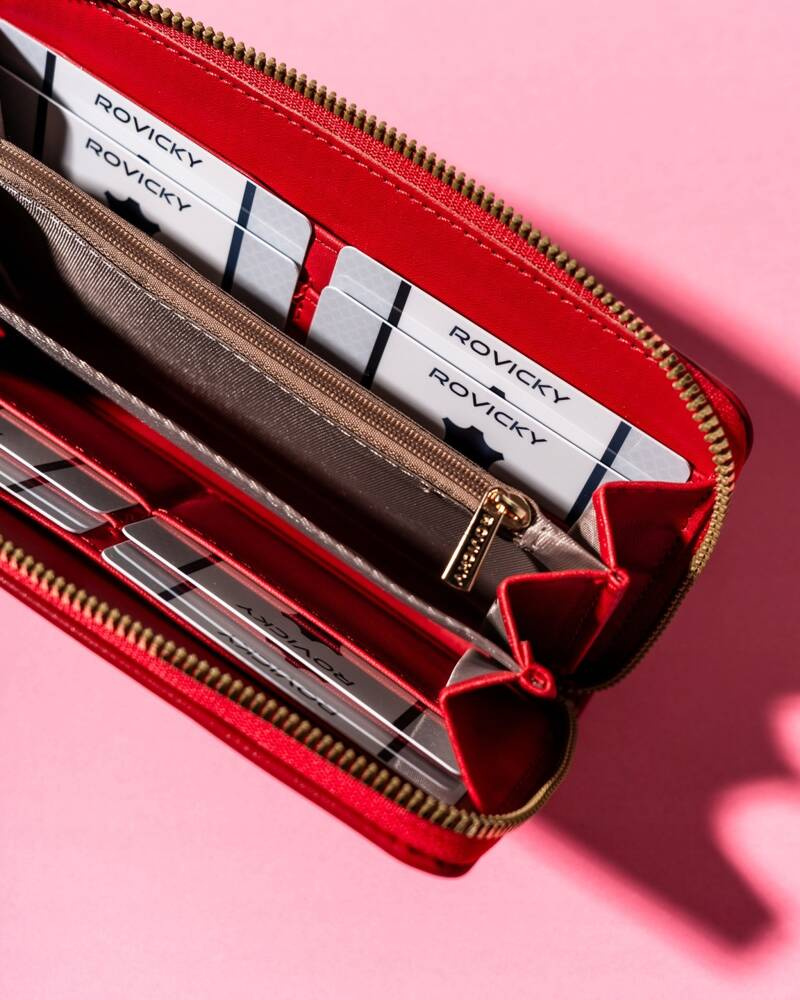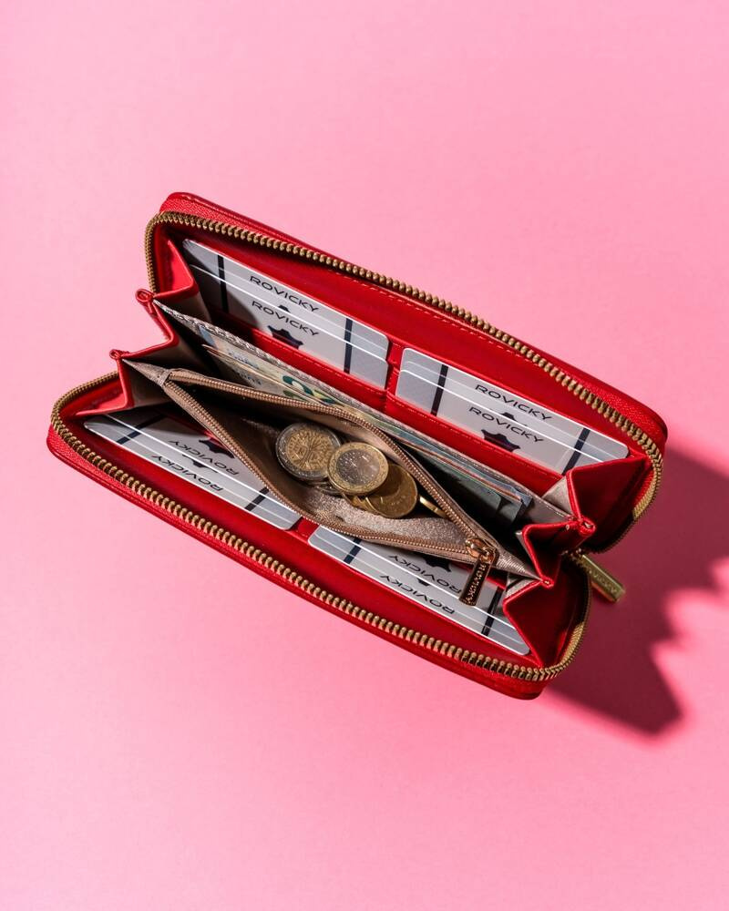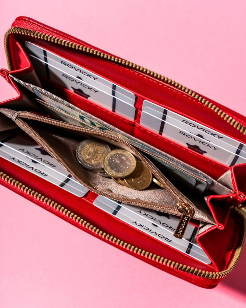 - Stílusos szerelvények | A pénztárca egyik nagy előnye az aranyszínű kiegészítők: egy cipzár és a Rovicky® márka logó az elején;