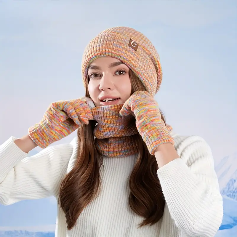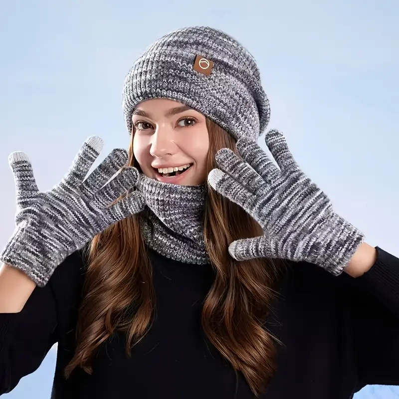 Téli szett sapkával, kesztyűvel és meleg sállal