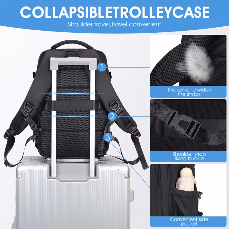 A hátizsák hátsó falán van egy fogantyú, amelyet a bőröndhöz rögzíthetsz.