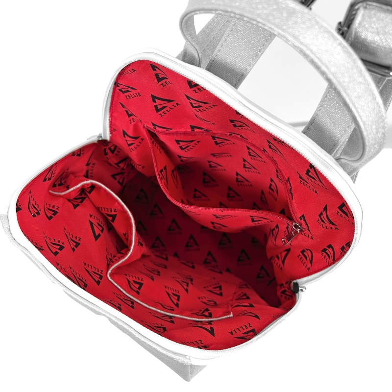 A belső tér piros béléssel van ellátva, amelyet fekete Zellia logók díszítenek. Több belső rekesz segíti a rendszerezést, így könnyen elférnek benne a mindennapi kellékek. A vállpántok állíthatók, hogy kényelmesen illeszkedjenek minden viselőhöz.