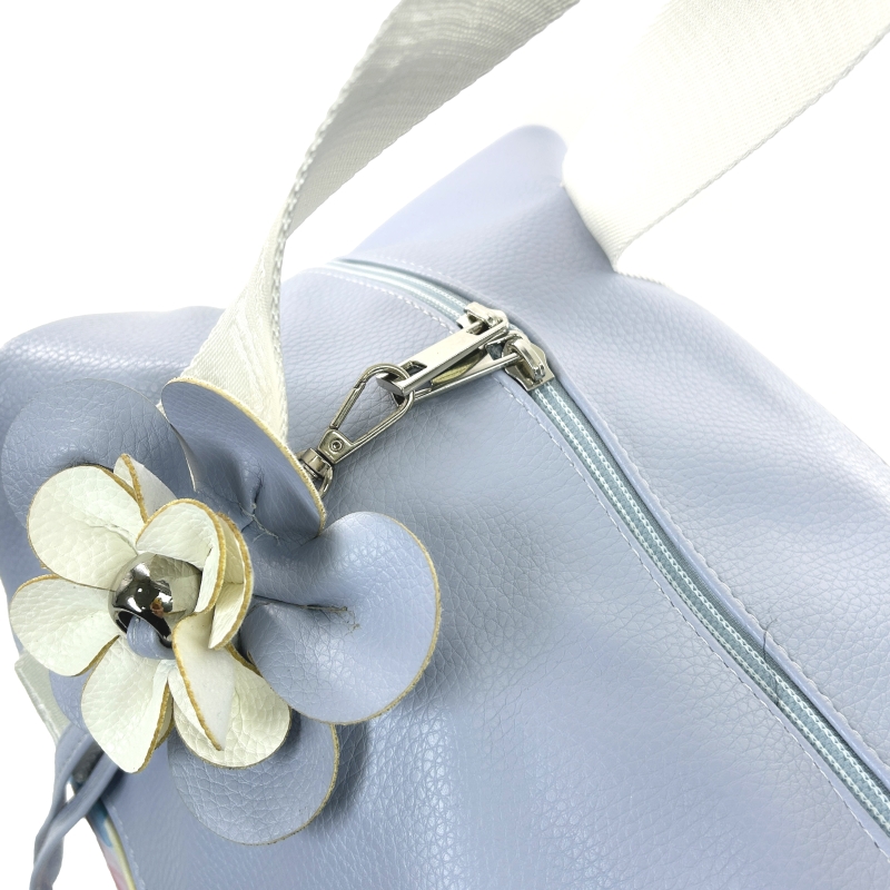 A táskán elhelyezett virágdísz és a cipzáron található virág kiegészítő egyedi megjelenést biztosít, miközben megőrzi a táska praktikus jellegét.
